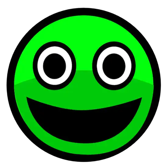 The default state. Bright green background, generic techno music, and a wide, vacant smile. It resembles the classic geometry dash faces or early internet emojis. It represents the “Facade.”